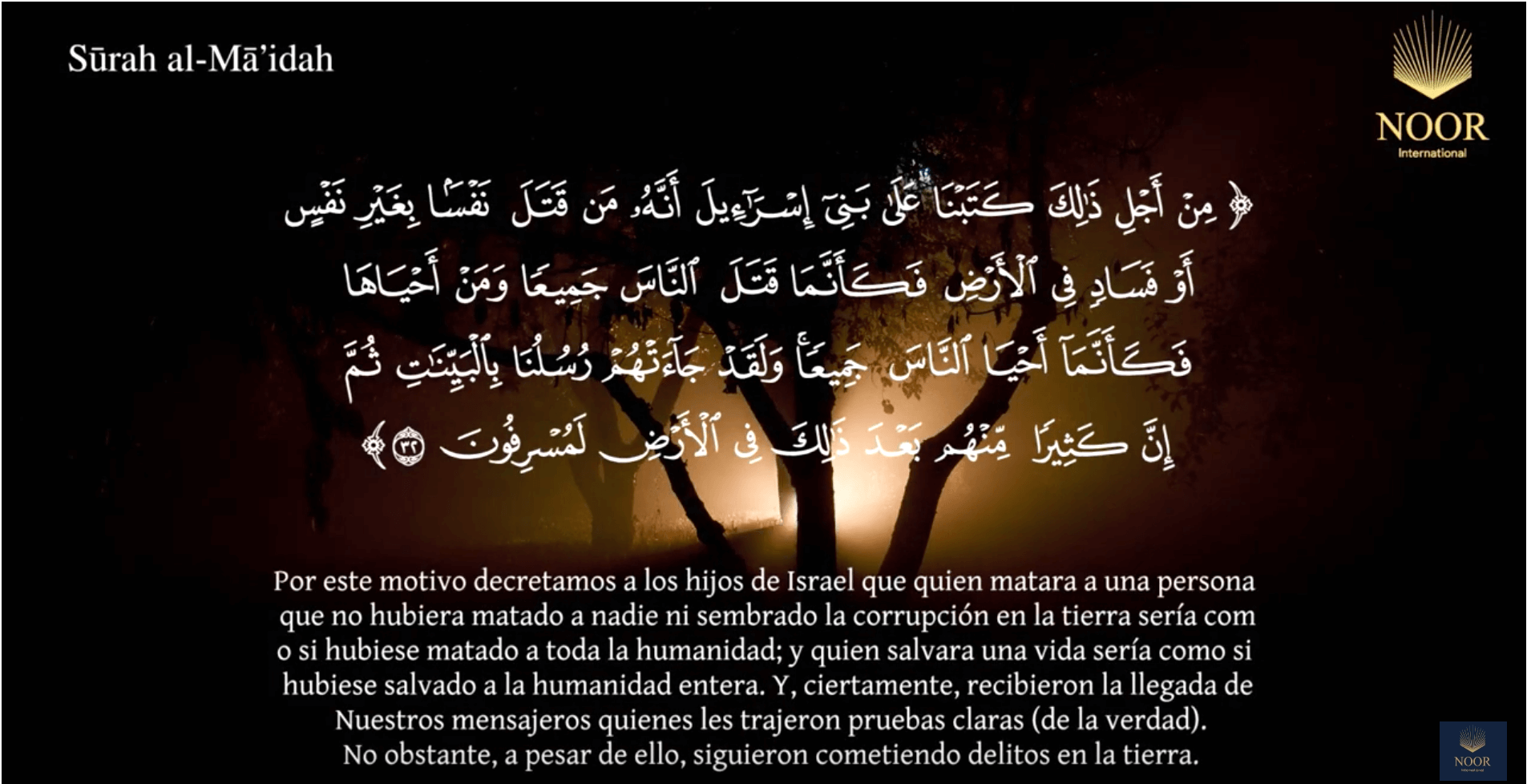 "Por este motivo decretamos a los hijos de Israel que quien matara a una persona que no hubiera matado a nadie ni sembrado la corrupción en la Tierra sería como si hubiese matado a toda la humanidad; y quien salvara una vida sería como si hubiese salvado a la humanidad entera. Y, ciertamente, recibieron la llegada de Nuestros mensajeros, quienes les trajeron pruebas claras (de la verdad). Pero, a pesar de ello, siguieron cometiendo delitos en la Tierra"